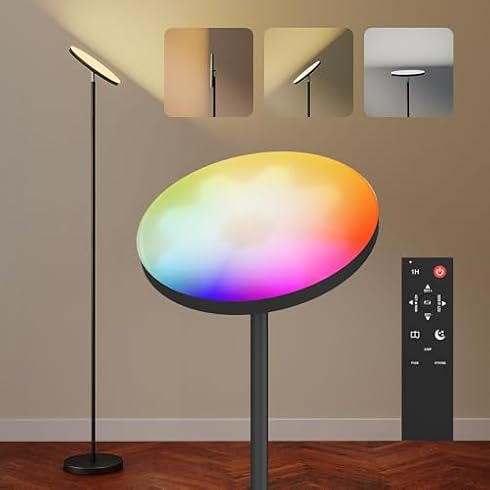 HOMCOM RGB Uplighter Floor Lamp, Tall Dimmable Standing Lamp with Remote & Touch Control, 350° Rotatable Head for Living Room Bedroom, 2700K-6000K Colour Temperatures, Black