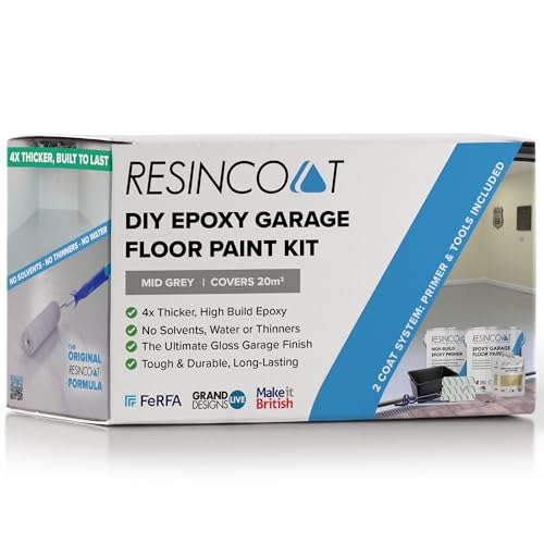 Resincoat Epoxy Garage Floor Paint Kit – Complete Primer, Paint & Tools Bundle – Covers up to 20m² – 4x Thicker High Build Coating for Concrete Floors – Durable Gloss Finish – Made in UK (Mid Grey)