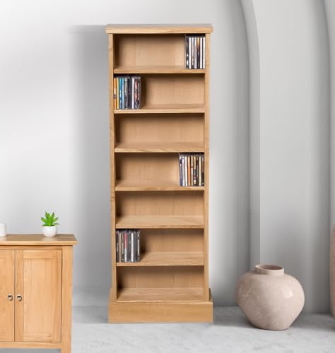 Hallowood Furniture Aston CD Storage Shelf Unit, 7-Tier Narrow CD Rack Tower, Solid Wooden Storage Unit for CDs, Books, Media, An Oak Furniture for Living Room, Bedroom & Office