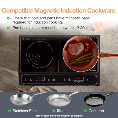 VonShef Double Induction Hob - 2800W Portable Dual, Twin Plate Electric Table Top with LED Display, Built-In Timer, 10 Heat Settings 60-240°C - Black