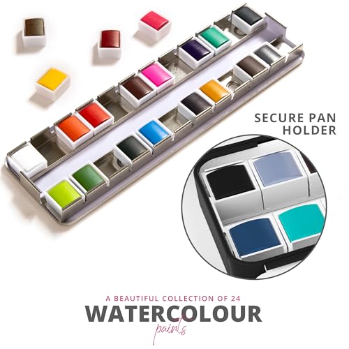 Creativepeak - Watercolour Paint Set - 24 Vibrant Watercolours with Blending Brush & Swatch Card - Portable Travel Tin & Mixing Palette for Artists - Professional Art Supplies