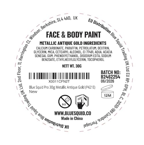 Blue Squid Face Paint Water Based Single Cake Professional Face Paint & Body Paint - Water Activated, Kids Adults Face Painting for Costume, Halloween Makeup - Metallic Antique Gold Face Paint 30g