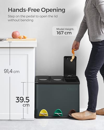 SONGMICS Kitchen Bin, 3-Compartment Rubbish Bin, 2 x 2.6 Gallons (10 L) and 7.9 Gallons (30 L), Steel, Space-Saving, Inner Buckets, Carbon Filter, 39.5 x 29.8 x 80.2 cm, Metallic Silver LTB551E50