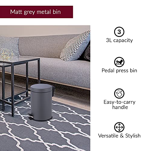 Innoteck Essentials Round Colour Coated Pedal Bin 3L Dustbin Size 26x17cm for Kitchen and bathroom, Matt Grey, Powder Coated Steel, 3 Litre