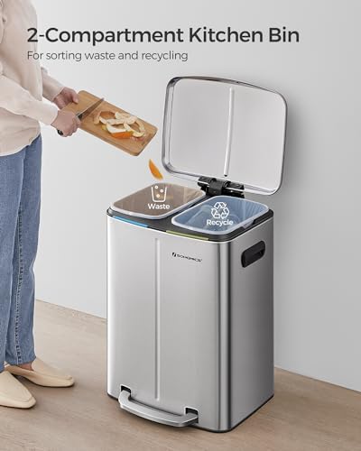SONGMICS Double Rubbish Bin, 2 x 20L Kitchen Bin, Dual Compartment Metal Step Bin, with Plastic Inner Buckets, Soft-Close Lids, and Handles, Odour Seal, Silver LTB40NL