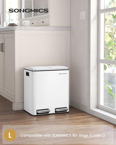 SONGMICS Kitchen Bin, 2 x 15 L Double Bin for Recycling and Waste, Pedal Bin, 15 Liners Included, Inner Buckets, Soft Close for Small Families, Steel, Cloud White LTB30WT
