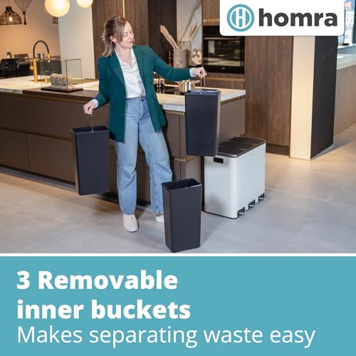 Homra Kitchen Bin 54L Sparq | Kitchen Pedal Recycling bin 3x18 Liters | Stainless Steel Pedal Bin | 3-Compartment Sorting System | Waste Separation System | Soft-Close Paper Basket | Cream White