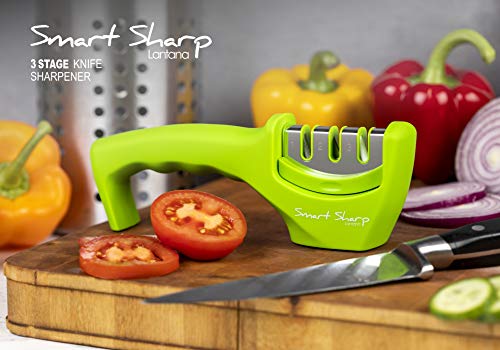 Lantana Smart Sharp Knife Sharpener - Professional 3 Stage Manual Sharpener for Sharpening Kitchen Knives - Ceramic Stone, Tungsten Carbide Plates, Diamond rods. Ergonomic Design (Green)