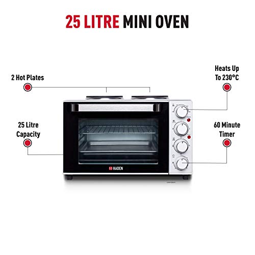 Haden 25L Mini Oven with Grill & Double Hot Plates – Versatile Table top Oven and Hob for Baking, Roasting, Boiling – Adjustable Temperature, 1400W Electric Counter Top Cooker with 60-Min Timer
