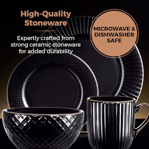 Tower T867002BLK Empire 16 Piece Dinnerware Set, Stoneware, Black and Brass