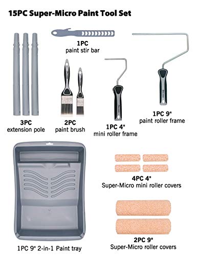 ROLLINGDOG Paint Roller Set - 9 Inch Paint Rollers and Tray Sets with Extension Pole,Paint Brush,Microfiber Roller Cover,15 PC Paint Roller Kit for Painting Walls and Ceilings