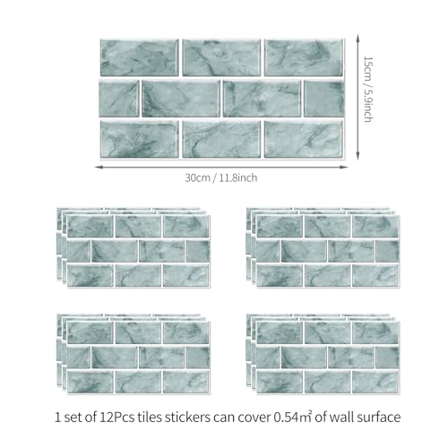 Green Brick Tile Stickers for Bathroom Kitchen Waterproof Vinyl Stick on Tiles Backsplash Self Adhesives Wall Tile Transfers Peel and Stick Tile Decals for Living Room - 30x15cm (12 Sheets)