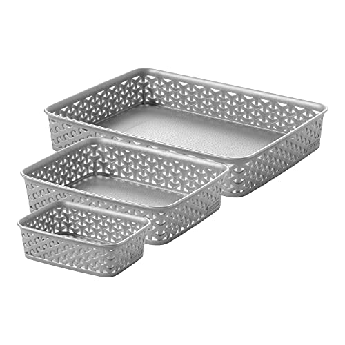 Curver My Style Rattan Effect Set of 3 Office Rectangular A4 A5 A6 Desk Storage Basket Tray Set - Light Grey