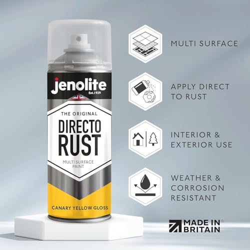 JENOLITE Directorust Gloss Spray Paint - CANARY YELLOW, 400ml - Direct To Rust, Multi Surface Gloss For Wood, Metal, Plastic, Ceramic - RAL 1018