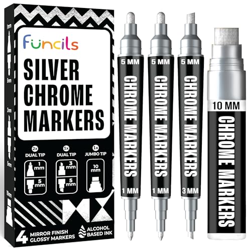 Funcils Liquid Chrome Marker - 4 Silver Chrome Paint Pen (1mm, 3mm, 5mm, 10mm) | Reflective, Mirror Effect Metallic Paint Markers for Metal, Plastic, Glass, Resin Art, Model Touch Up - Oil Markers