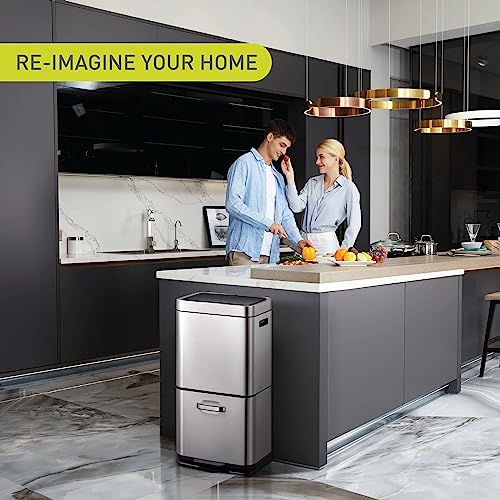 EKO Mirage Plus 60L rubbish bin with 3 compartments- 2x15L+30L,large stainless steel sensor kitchen bin recycling and waste,automatic trash can with Lid and 3 plastic inner buckets