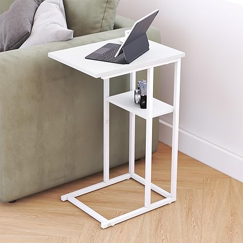 Yusong C Shaped End Table, Side Tables Slide Under Sofa Couch Bed, Small TV Tray Bedside Table for Small Spaces, Living Room, Bedroom, White