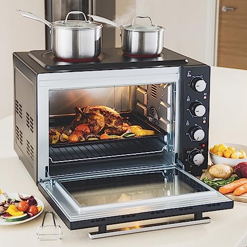 Cooks Professional Mini Portable Oven with Ceramic Hobs | Energy Efficient Electric Countertop Cooker with Two Hot Plates & Wire Rack Baking Tray | Kitchen Grill Ovens | 48L Capacity | Black & Silver