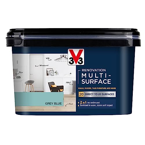V33 Renovation Multi-Surface Paint - No Undercoat Needed - Over 20 Surfaces - Resistance To Water Stains & Impact - High Coverage - Grey Blue Satin 2 Litres
