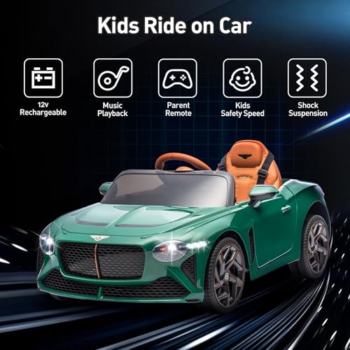 ZYMY Electric Cars for Kids, Bentley Licensed 12V Electric Ride On Cars with Remote Control, Music, Light, MP3, Suspension Wheels, Children Riding Car for Ages 3-8 Years Green