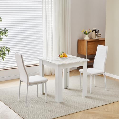 NICEME Compact Dining Table and 2 Chairs, Small Dining Room Set for 2 Seater Kitchen Table with Chairs for Small Space Saving, Glossing Tabletop 75x75 cm (Marble-White Table, 2 Seats, PU White #1)