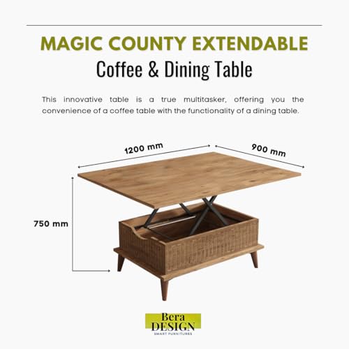 BERA DESIGN Extendable Dining Table 6-8 Seater, Lift Top Coffee Table, Extendable & Foldable Coffee Table Converts to Dining Table - 90x60x45cm with 3 Variable Height Level