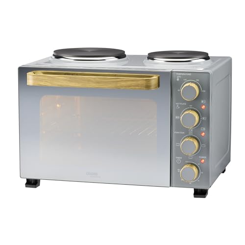 Cooks Professional Mini Portable Oven with Hobs | Energy Efficient Electric Countertop Cooker with Two Hobs & Wire Rack Baking Tray | Kitchen Table Ovens | 34L Capacity | Grey Nordic