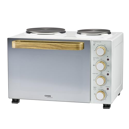 Cooks Professional Mini Oven with Hobs | Energy Efficient Electric Countertop Cooker with Two Hot Plate Hobs & Wire Rack Baking Tray | Kitchen Table Top Grill Ovens | 28L Capacity | Nordic White…