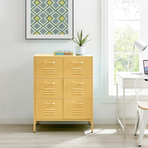 Furniturebox UK Mustard Yellow Metal 6 Drawer Sideboard - Teksi - Industrial Metal Locker Filing Style Cabinet - Living Room Bedroom Bathroom Office Storage - Chest of Drawers - Modern Fun Design