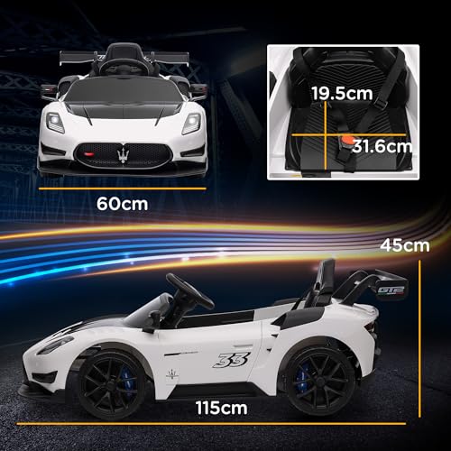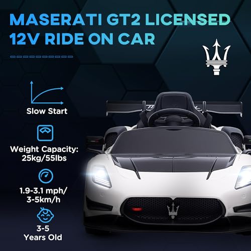 AIYAPLAY Maserati GT2 Licensed 12V Electric Car for Kids, Kids' Electric Ride on with Suspension System, Remote Control, USB, Music, Horn, Lights, Auxiliary Wheels, for Ages 3-5 Years, White