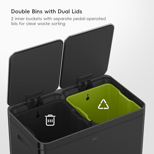 EKO Edison Dual Kitchen Bin for Recycling and Trash, 2x30 Litre Rubbish Bin with Dual Removable Inner Liners, Independent Lids and Pedals, Matt Black Stainless Steel
