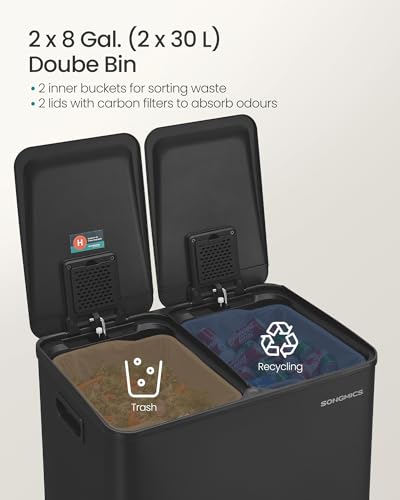 SONGMICS Kitchen Bin, 2 x 8 Gallon (2 x 30 L) Dual-Compartment Pedal Rubbish Bin with Soft-Close Lid and Inner Buckets, Steel, Includes 15 Liner Bags, Ink Black LTB741B02