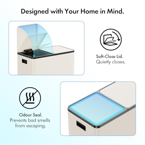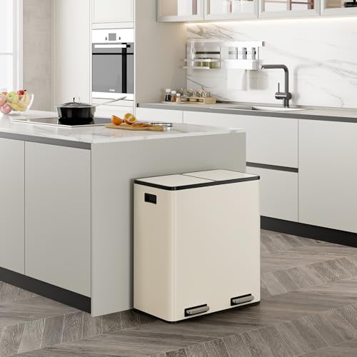 VonHaus Kitchen Bin, 60L Double Recycling Bin for Kitchen, Two Section Food Waste Separation System with Non-Slip Base & Removable Inner-Compartments, Large Airtight Trash Can, 2 x 30L (Cream)