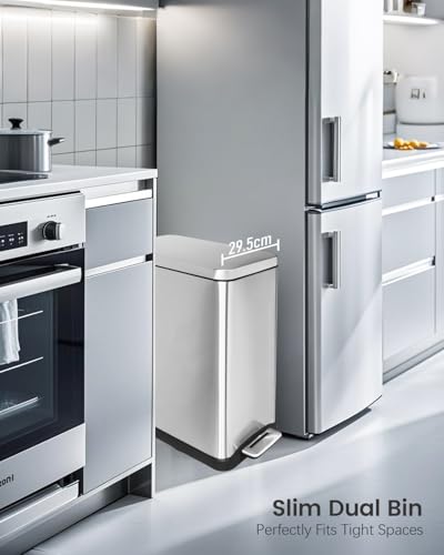 JM ·YIPENG Recycling Bins, 50L Slim Double Kitchen Bin,20+30L Double Pedal Bin with Lids and Plastic Inner Buckets,Stainless Steel Dual Bins for Kitchen Recycling and Waste,Silver